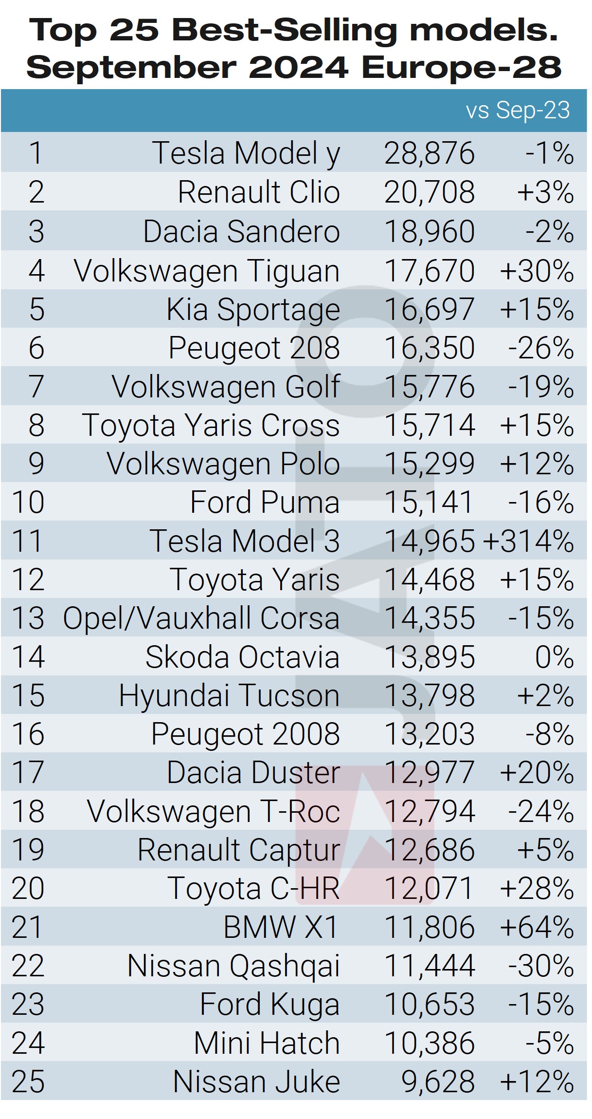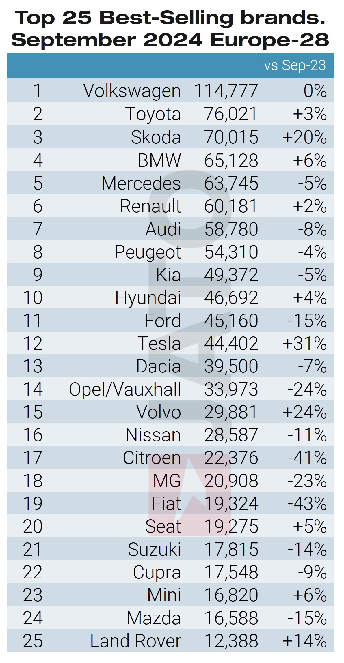 Volkswagen Group’s overall sales increased by 2% in September, primarily driven by the strong performance of Skoda, which became the third best-selling car brand in Europe. Other Volkswagen Group brands such as Toyota (+4%), BMW Group (+6%), and Geely Group (+25%) also contributed to the group’s positive results.